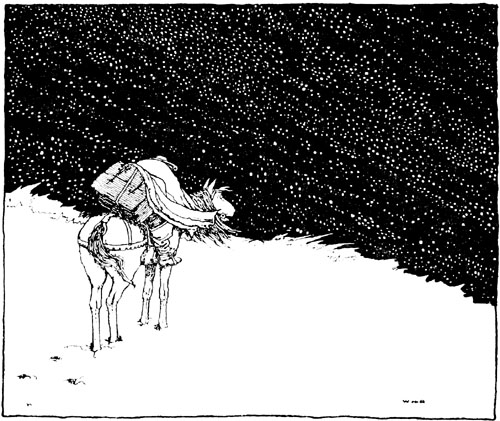 The merchant duly set forth; but when he reached his destination there was a law-suit over his merchandise, and after much trouble he returned poorer than he had been before. With only thirty miles to go before reaching home, he was already looking forward to the pleasure of seeing his children again, when he found he had to pass through a large wood. Here he lost himself. It was snowing horribly; the wind was so strong that twice he was thrown from his horse, and when night came on he made up his mind he must either die of hunger and cold or be eaten by the wolves that he could hear howling all about him.