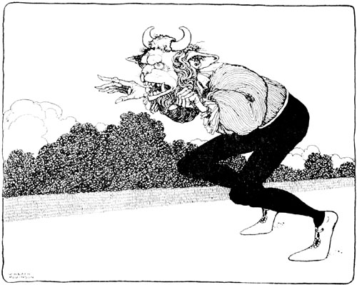 Having drunk his chocolate the good man went forth to look for his horse. As he passed under a bower of roses he remembered that Beauty had asked for one, and he plucked a spray from a mass of blooms. The very same moment he heard a terrible noise, and saw a beast coming towards him which was so hideous that he came near to fainting.