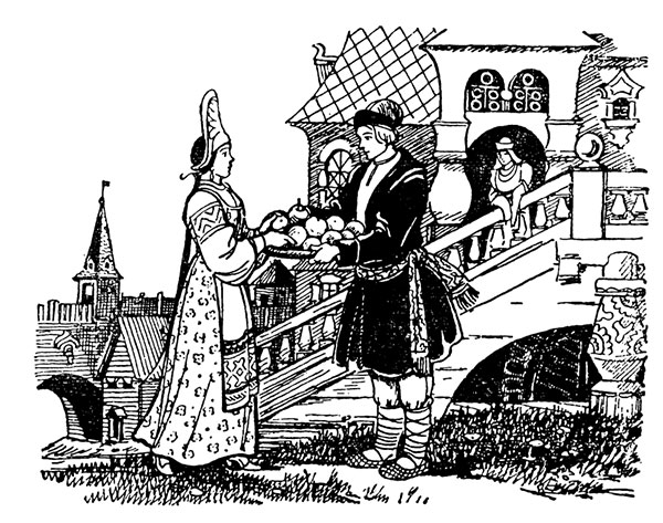 — Не поможешь ли мне, бабушка, достать лоток да поддёвку, в какой купцы ходят? Переоденусь я, пойду эти молодильные яблоки продавать.