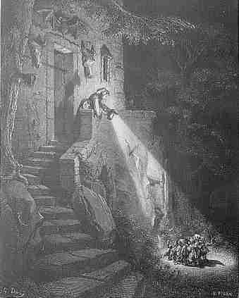 На краю леса они увидели домик с огоньками в окошечках. Они постучались в дверь, и женский голос ответил им, что они могут войти. Они вошли и Мальчик-с-пальчик сказал женщине, вышедшей к ним навстречу: