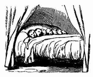 Добрая женщина была рада, что приключение закончилось так благополучно. Она сытно накормила их и уложила в комнате, где спали ее собственные дочери — молодые людоедки. Они все спали на одной большой кровати, и у каждой на голове была золотая корона. Они все были очень страшные: с крошечными глазками, крючковатыми носами и огромным ртом, из которого выставлялись гигантские острые зубы. В комнате стояла еще одна большая кровать. Жена людоеда уложила на нее мальчиков.