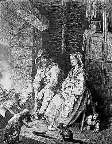 Жил-был однажды дровосек, и было у них с женой семеро сыновей: два близнеца по десять лет, два близнеца по девять лет, два близнеца по восемь лет и один младшенький семи лет. Он был очень маленький и молчаливый. Когда он родился, то был ростом не больше вашего пальца, поэтому его и назвали Мальчик-с-пальчик. Он был очень умен, хотя родители и братья считали его дурачком, поскольку он все время молчал. Но зато он отлично умел слушать собеседника. Дровосек был очень беден, и семья постоянно жила впроголодь. Однажды случилась засуха, и погиб весь урожай. Везде наступил голод. Однажды вечером дровосек сказал своей жене: