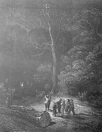 Наступила ночь, и подул холодный сильный ветер. Мальчики промочили свои ботинки. Пошел сильный холодный дождь. Мальчик-с-пальчик вскарабкался на дерево посмотреть, не видно ли дороги домой. Далеко в левой стороне он увидел огонек. Он слез с дерева и повел братьев налево.