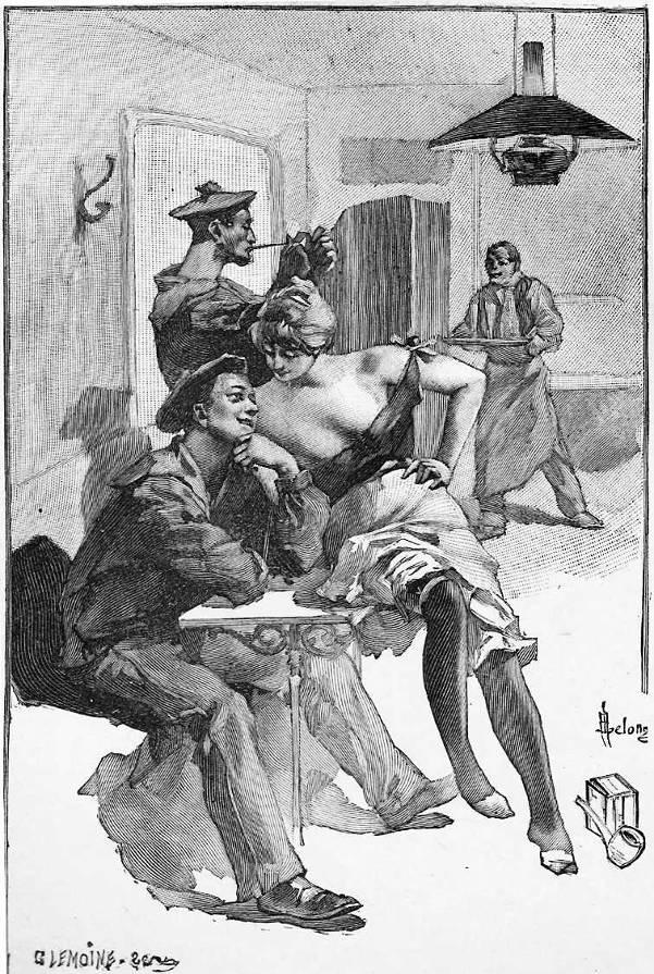 La maison avait deux entrées. à l’encoignure, une sorte de café borgne s’ouvrait, le soir, aux gens du peuple et aux matelots. Deux des personnes chargées du commerce spécial du lieu étaient particulièrement destinées aux besoins de cette partie de la clientèle. Elles servaient, avec l’aide du garçon, nommé Frédéric, un petit blond imberbe et fort comme un bœuf, les chopines de vin et les canettes sur les tables de marbre branlantes, et, les bras jetés au cou des buveurs, assises en travers de leurs jambes, elles poussaient à la consommation.