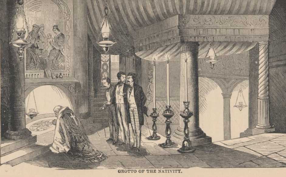 I have no “meditations,” suggested by this spot where the very first “Merry Christmas!” was uttered in all the world, and from whence the friend of my childhood, Santa Claus, departed on his first journey, to gladden and continue to gladden roaring firesides on wintry mornings in many a distant land forever and forever. I touch, with reverent finger, the actual spot where the infant Jesus lay, but I think—nothing.