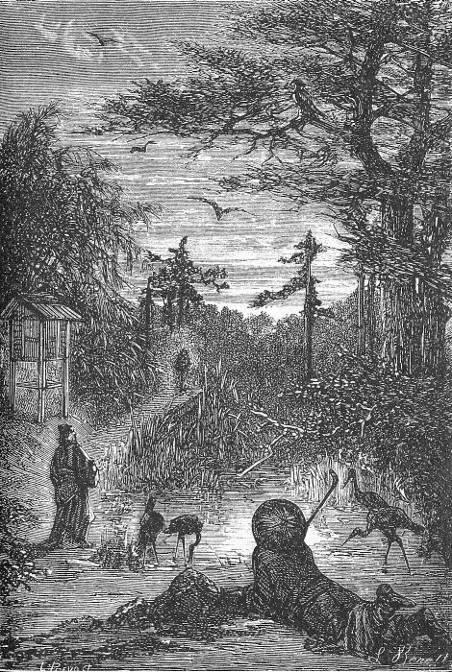 Passepartout wandered for several hours in the midst of this motley crowd, looking in at the windows of the rich and curious shops, the jewellery establishments glittering with quaint Japanese ornaments, the restaurants decked with streamers and banners, the tea-houses, where the odorous beverage was being drunk with “saki,” a liquor concocted from the fermentation of rice, and the comfortable smoking-houses, where they were puffing, not opium, which is almost unknown in Japan, but a very fine, stringy tobacco. He went on till he found himself in the fields, in the midst of vast rice plantations. There he saw dazzling camellias expanding themselves, with flowers which were giving forth their last colours and perfumes, not on bushes, but on trees, and within bamboo enclosures, cherry, plum, and apple trees, which the Japanese cultivate rather for their blossoms than their fruit, and which queerly-fashioned, grinning scarecrows protected from the sparrows, pigeons, ravens, and other voracious birds. On the branches of the cedars were perched large eagles; amid the foliage of the weeping willows were herons, solemnly standing on one leg; and on every hand were crows, ducks, hawks, wild birds, and a multitude of cranes, which the Japanese consider sacred, and which to their minds symbolise long life and prosperity.