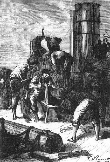 It was necessary to have dry wood to keep the steam up to the adequate pressure, and on that day the poop, cabins, bunks, and the spare deck were sacrificed. On the next day, the 19th of December, the masts, rafts, and spars were burned; the crew worked lustily, keeping up the fires. Passepartout hewed, cut, and sawed away with all his might. There was a perfect rage for demolition.