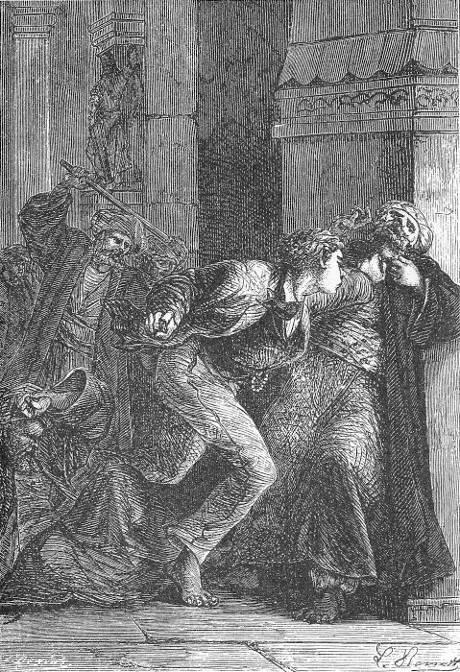 Passepartout, entré là, sans penser à mal, comme un simple touriste, admirait, à l’intérieur de Malebar-Hill, ce clinquant éblouissant de l’ornementation brahmanique, quand soudain il fut renversé sur les dalles sacrées. Trois prêtres, le regard plein de fureur, se précipitèrent sur lui, arrachèrent ses souliers et ses chaussettes, et commencèrent à le rouer de coups, en proférant des cris sauvages.