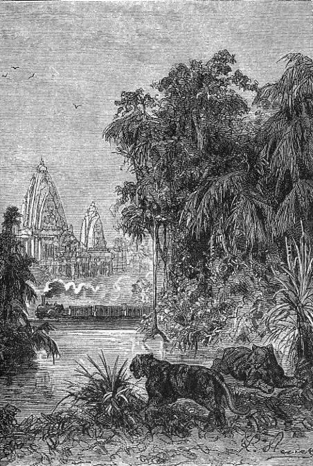 Passepartout, réveillé, regardait, et ne pouvait croire qu’il traversait le pays des Indous dans un train du « Great peninsular railway ». Cela lui paraissait invraisemblable. Et cependant rien de plus réel ! La locomotive, dirigée par le bras d’un mécanicien anglais et chauffée de houille anglaise, lançait sa fumée sur les plantations de caféiers, de muscadiers, de girofliers, de poivriers rouges. La vapeur se contournait en spirales autour des groupes de palmiers, entre lesquels apparaissaient de pittoresques bungalows, quelques viharis, sortes de monastères abandonnés, et des temples merveilleux qu’enrichissait l’inépuisable ornementation de l’architecture indienne. Puis, d’immenses étendues de terrain se dessinaient à perte de vue, des jungles où ne manquaient ni les serpents ni les tigres qu’épouvantaient les hennissements du train, et enfin des forêts, fendues par le tracé de la voie, encore hantées d’éléphants, qui, d’un œil pensif, regardaient passer le convoi échevelé.