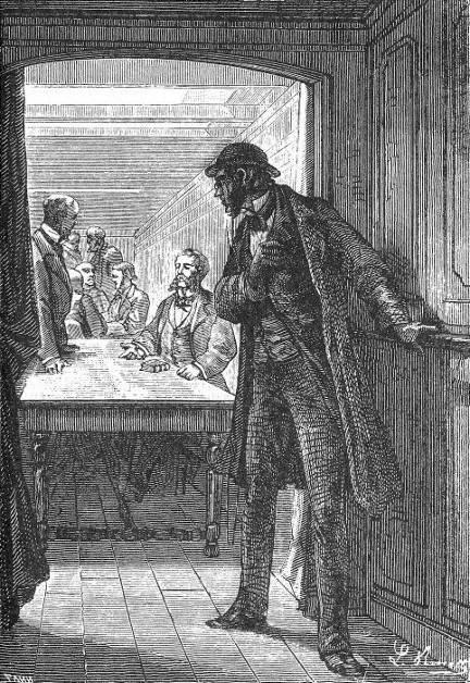 Depuis ce jour, Passepartout et le détective se rencontrèrent fréquemment, mais l’agent se tint dans une extrême réserve vis-à-vis de son compagnon, et il n’essaya point de le faire parler. Une ou deux fois seulement, il entrevit Mr. Fogg, qui restait volontiers dans le grand salon du Rangoon, soit qu’il tînt compagnie à Mrs. Aouda, soit qu’il jouât au whist, suivant son invariable habitude.