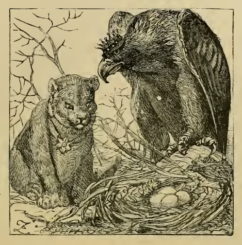 By good fortune, or the opposite — we shall find out which before long, — another king, the king of birds, the Eagle, an old acquaintance and friend of the Lion, heard of that monarch’s difficulty, and, wishing to do his friend a great kindness, offered to educate the young Lion himself. The Lion felt as if a weight were taken off his shoulders ; and no wonder. What could be better, as it seemed, than to find a king as a prince’s tutor ? So the Lion-cub was got ready, and sent off to the Eagle’s court, there to learn how to govern.