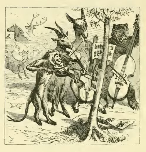 THE tricky Monkey, the Goat, the Ass, and bandy-legged Mishka the Bear, determine to play a quartette. They provide themselves with the necessary pieces of music — with two fiddles, and with an alto and a counter-bass. Then they sit down on a meadow under a lime-tree, prepared to enchant the world by their skill. They work away at their fiddlesticks with a will; and they make a noise, but there is no music in it.