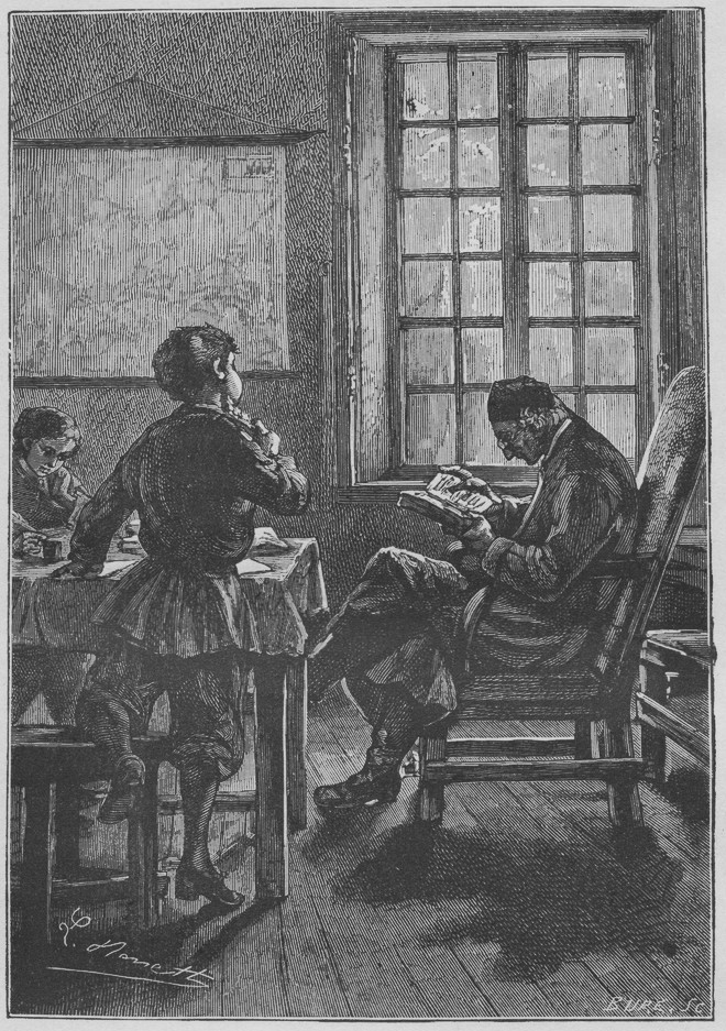 Notre précepteur, à mon frère et à moi, vêtu d’une robe de chambre d’indienne, retenue à la taille par une ceinture de même étoffe, et coiffé d’une calotte rouge tricotée, ornée d’un gland, les jambes enfouies dans des bottes molles en peau de bouc, continuait à longer les murs pour viser les mouches, et tapait à vide avec un bruit retentissant.
