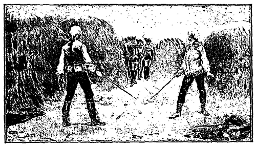 Nous partîmes en silence, et, après avoir descendu un sentier escarpé, nous nous arrêtâmes sur le bord de l’eau, et nos épées se croisèrent.
