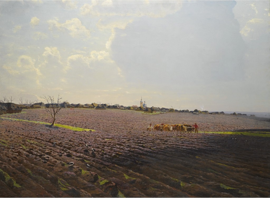 | The Land by Nikolai Nikanorovich Dubovskoy – 1894 – Style: Genre: Landscape Media: Oil on canvas. Dimensions: 104 X 143 cm Location: Private collector Inscription: Signature and date bottom right: Н Дубовской 94 “La Terre” par Nikolai Nikanorovitch Dubovski / Земля – Николай Никанорович Дубовской – 1894 |