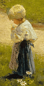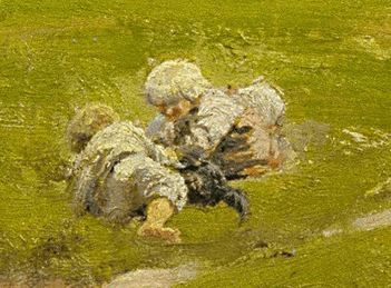 Devant lui et à gauche se trouve le plus âgé des enfants qui est fasciné par une fleur cueillie, et ne remarque ni le bébé qui pleure, ni le gloussement des poulets.